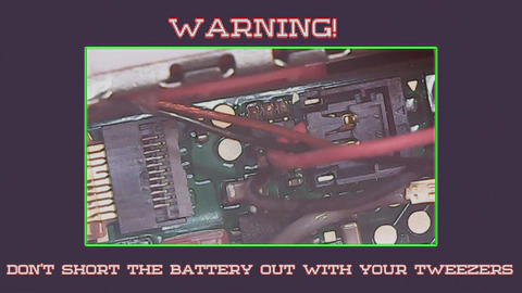 Note that the metal contacts are connected directly to the battery, which is charged. If you short these out using your tweezers, it could damage the battery in quite an exciting manner.